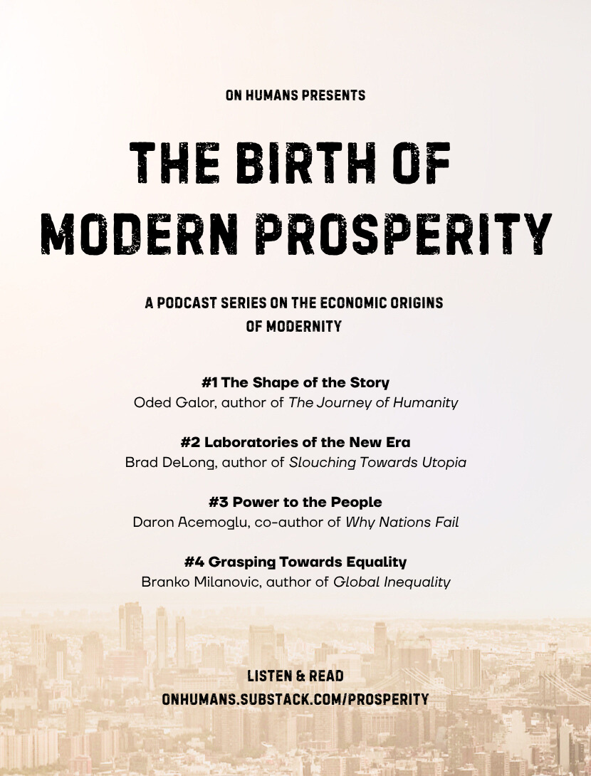 During the past year and a half, I’ve had the privilege of talking about this question with many outstanding scholars. Each of these episodes was thought-provoking. Here is my attempt to connect the dots: a mini-series on “The Birth of Modern Prosperity”. It consists of curated highlights, around 30 minutes each, from these episodes, which would total almost 6 hours in their original.